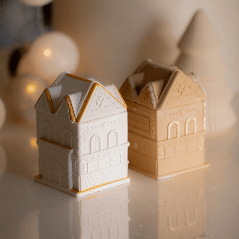 Δύο χρώματα από χειροποίητα σπιτάκια, που αποπνέουν θαλπωρή, οικειότητα και γιορτινό πνεύμα.