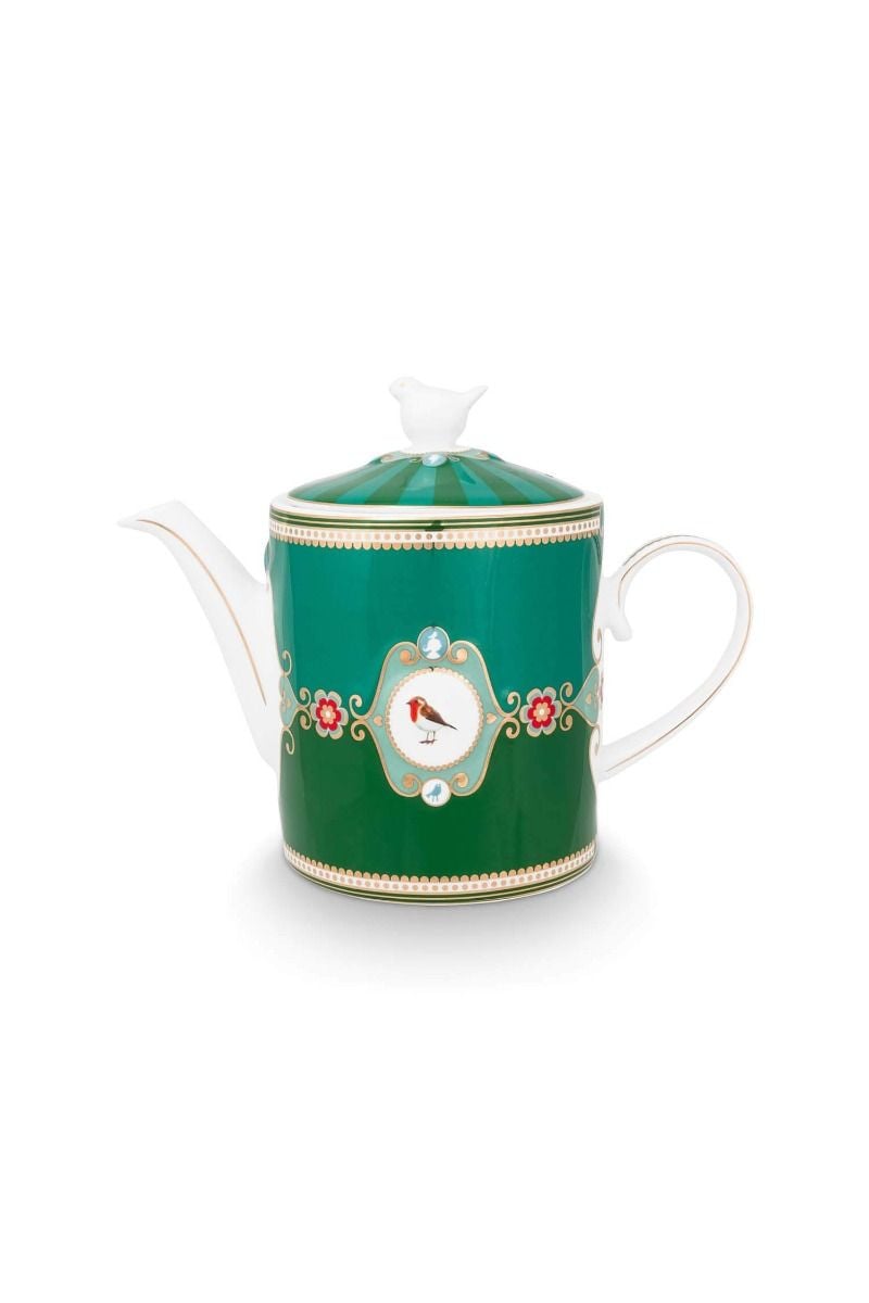 Αυτή η πράσινη τσαγιέρα ανήκει στη διαχρονικά αγαπημένη συλλογή Love Birds της Pip Studio. Το κεντρικό της στοιχείο είναι ένας ζωντανός, πολύχρωμος κοκκινολαίμης μέσα σε ανάγλυφο μετάλλιο, που της χαρίζει ξεχωριστό χαρακτήρα. Το χρυσό τελείωμα ενισχύει τη ρομαντική και εκλεπτυσμένη αισθητική της.